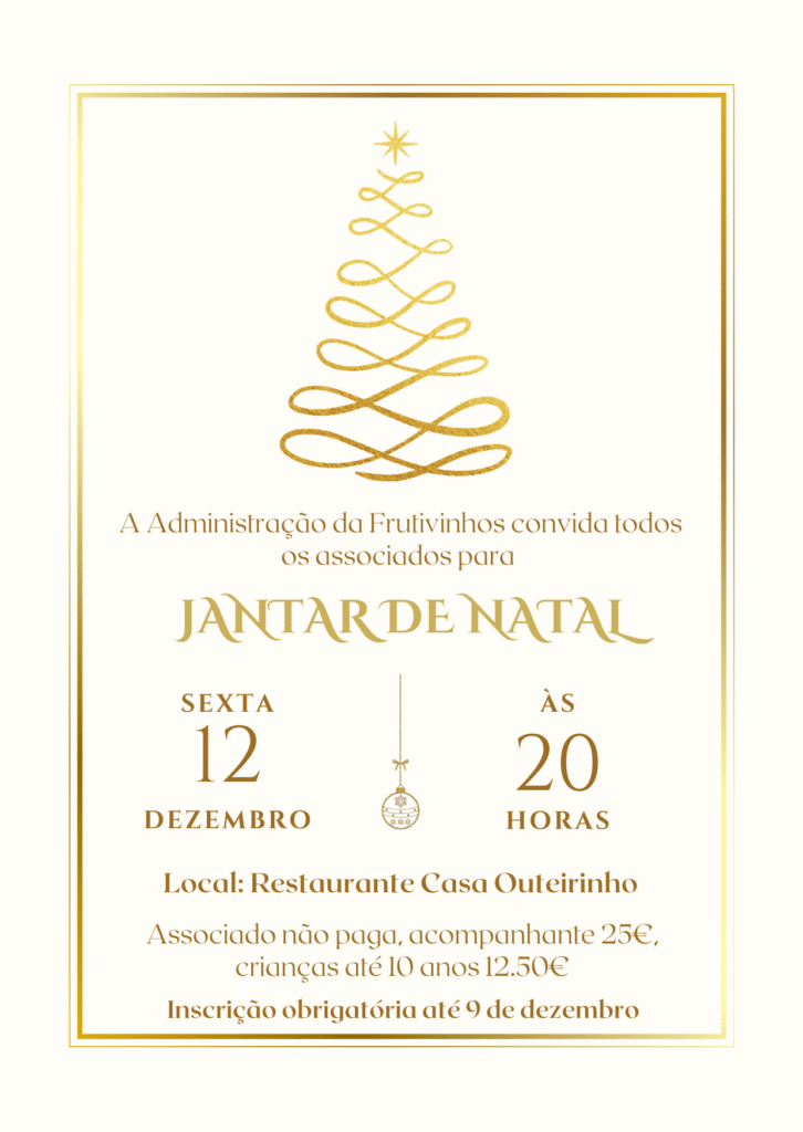 A Administração da Frutivinhos convida todos os associados para o Jantar de Natal, que terá lugar na sexta-feira, dia 12 de dezembro, às 20 horas, no Restaurante Casa Outeirinho. A participação é gratuita para associados, sendo o valor para acompanhantes de 25€ e para crianças até aos 10 anos de 12,50€. A inscrição é obrigatória até 9 de dezembro.